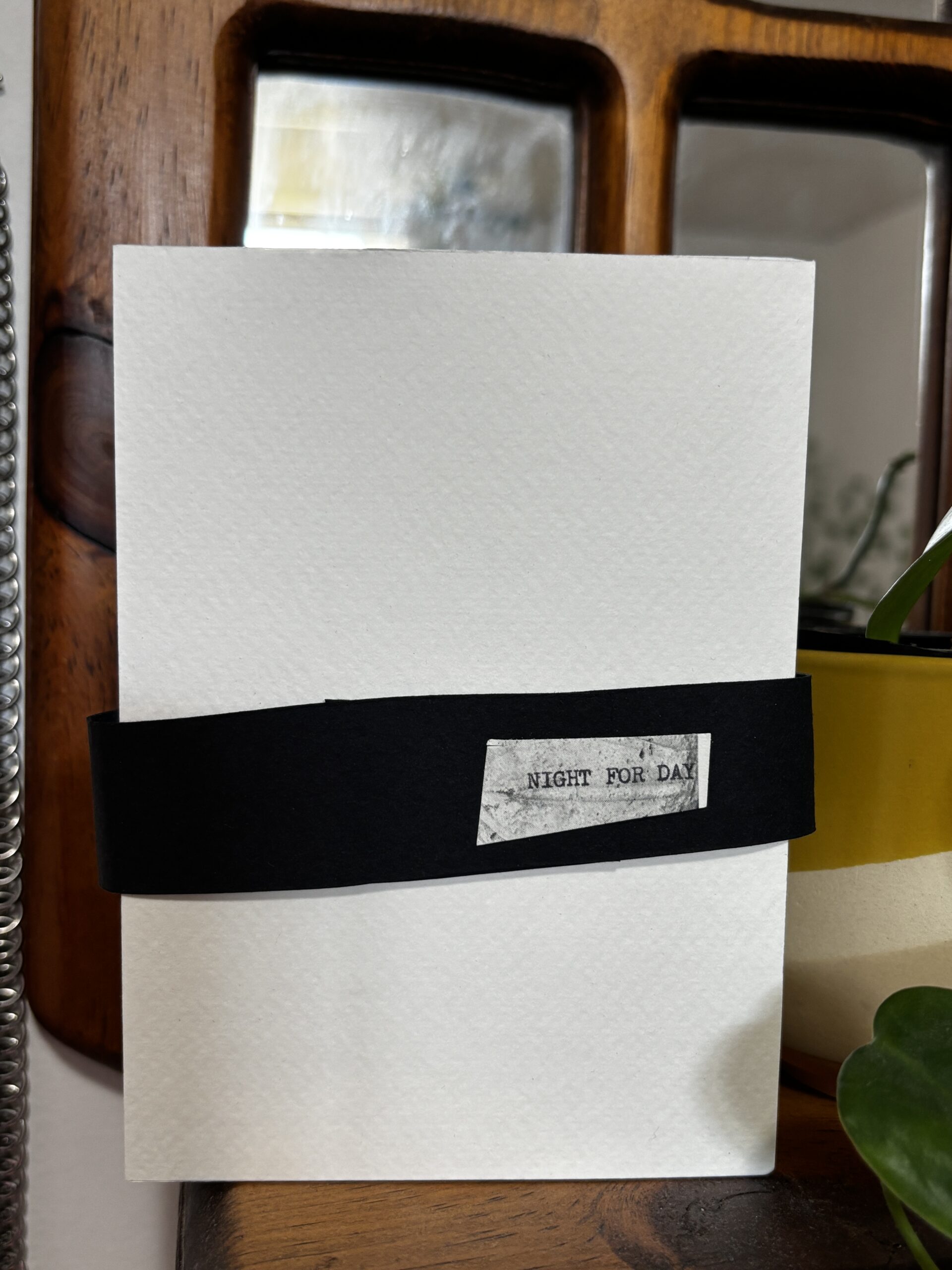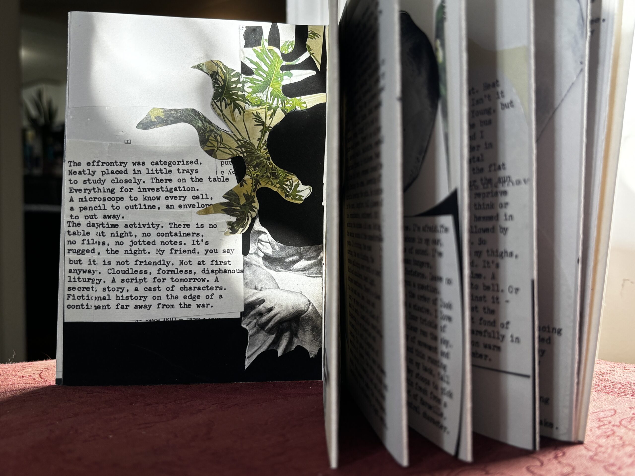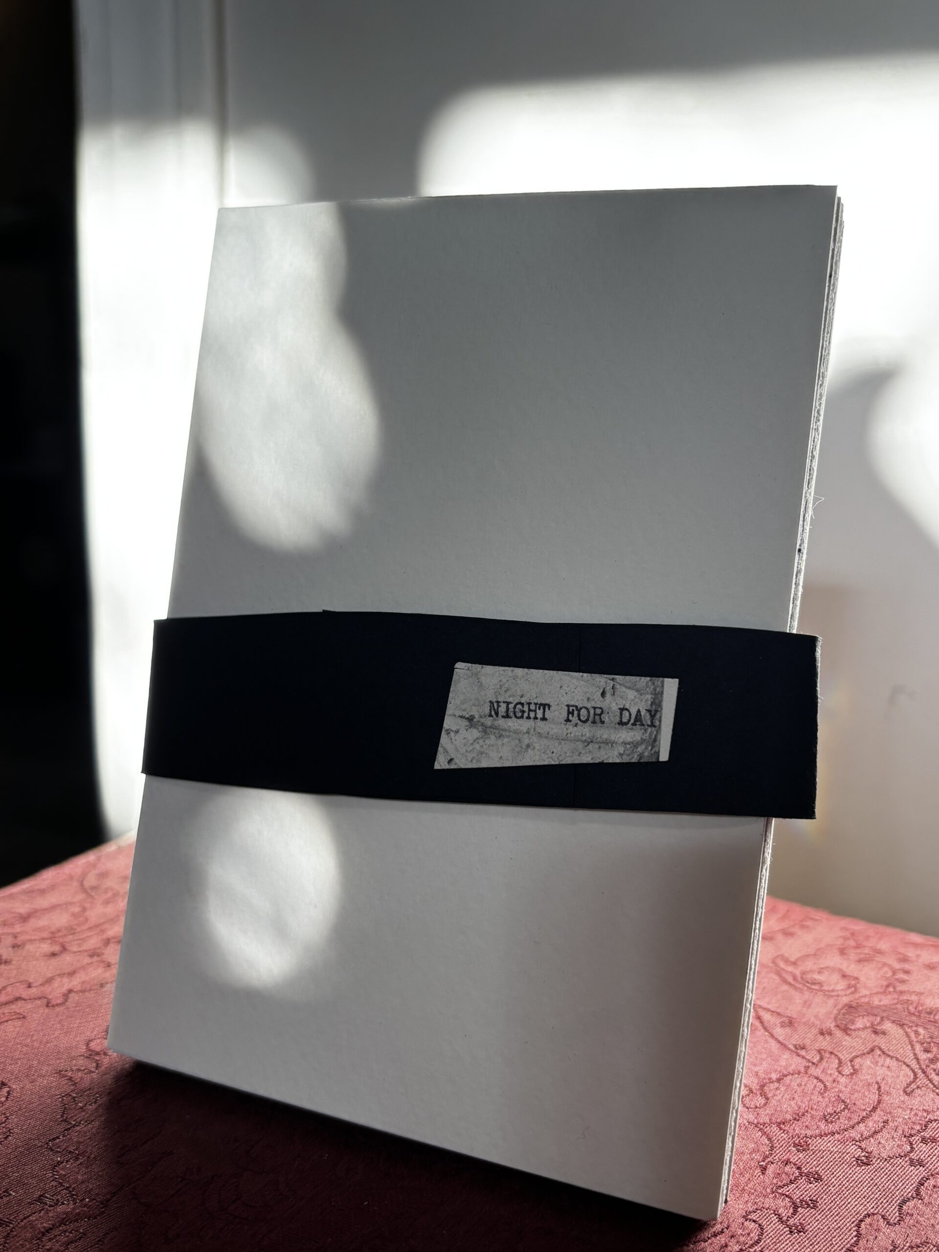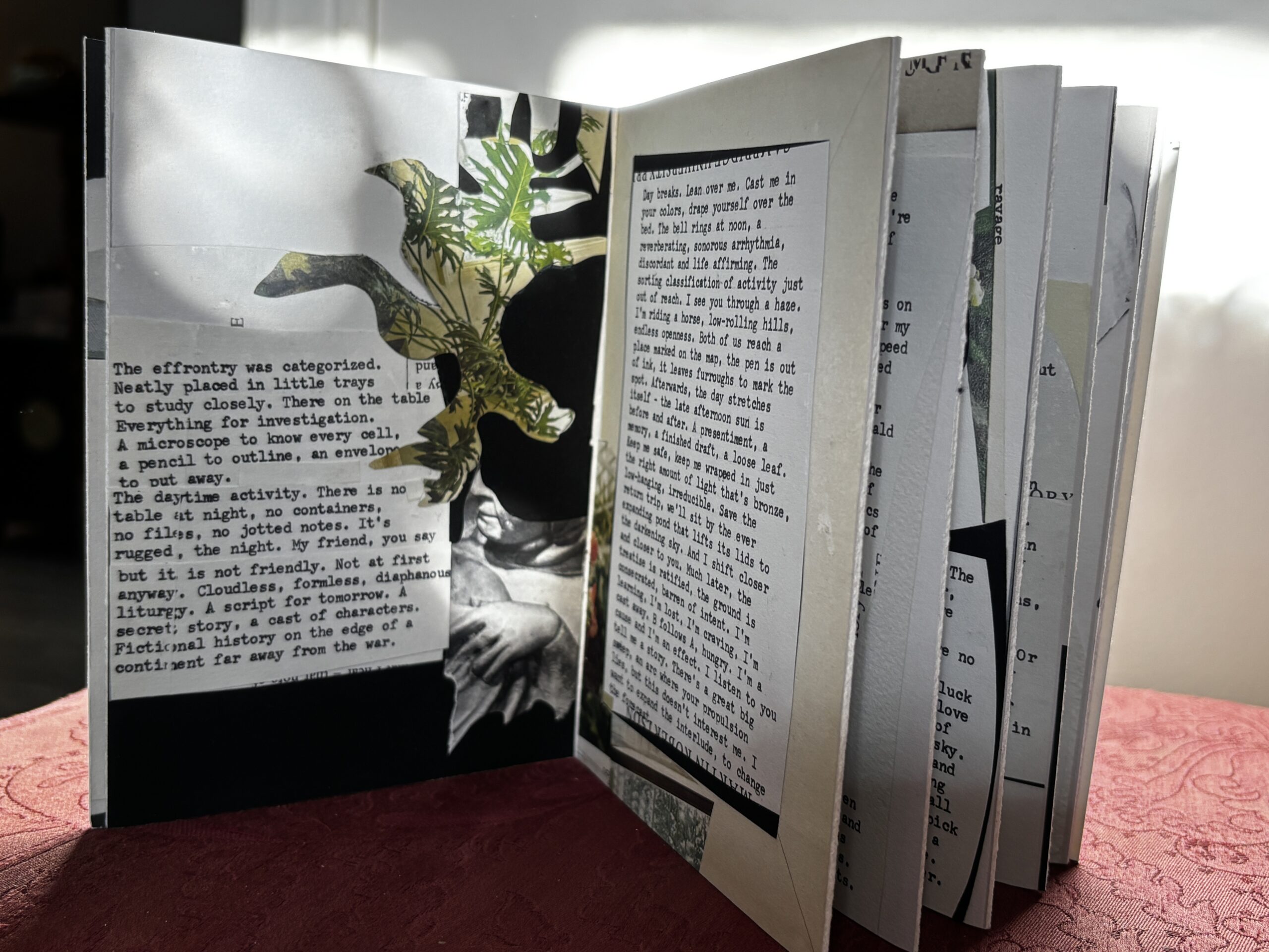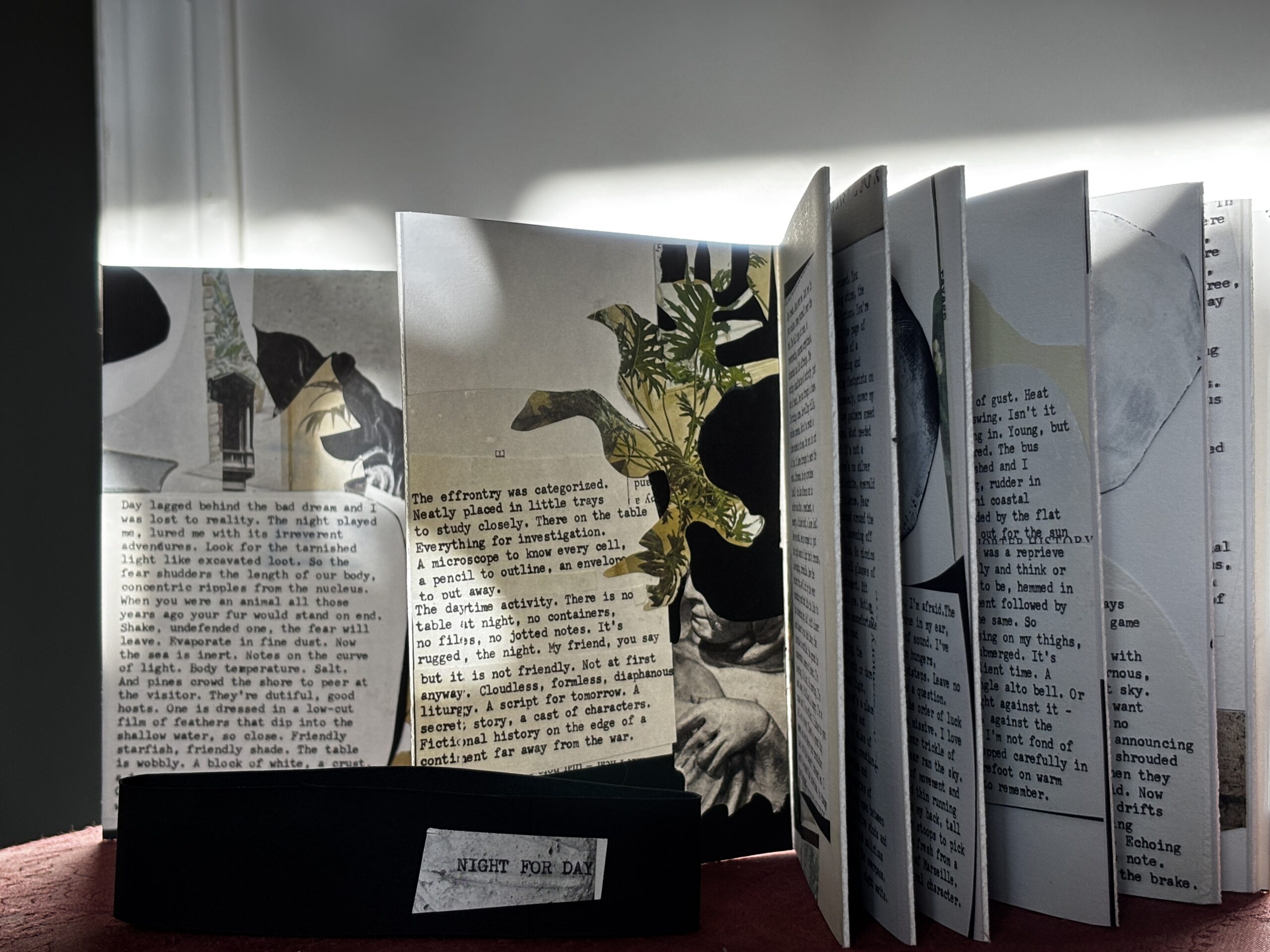 Night for Day was created during the later part of the pandemic as a reflection on the tenuousness of life, our connection to others, and on a parallel kind of default resilience. Each page of collage and text, in accordion book style, moves back and forth between day and night as loose metaphors for light and darkness. Not as literal states of being, but rather as a way to explore nuance and complexity in these polarities. The choice to move between the two over the course of sixteen pages is also a response to the passing of time and to regenerative possibilities. This limited edition accordion book is created from a giclée print of the original, fully expanded, 68” book, assembled and finished with a handmade cover. Each cover band is unique, with the title typewritten on a fragment of old, repurposed book pages.